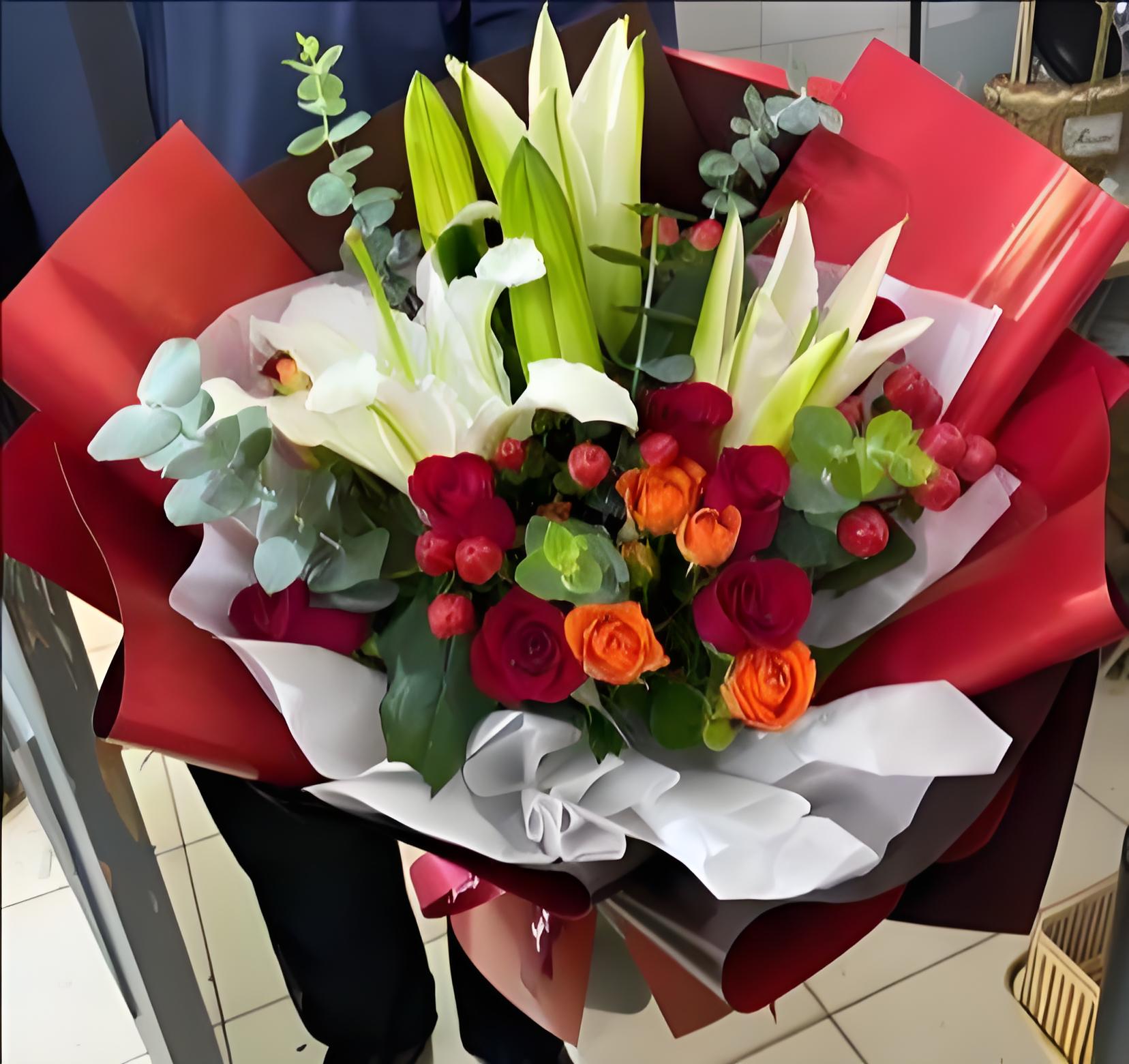 铜川王益区花店包11枝红玫瑰、2枝多头白百合、6枝橙色多头玫瑰、红豆、尤加利叶